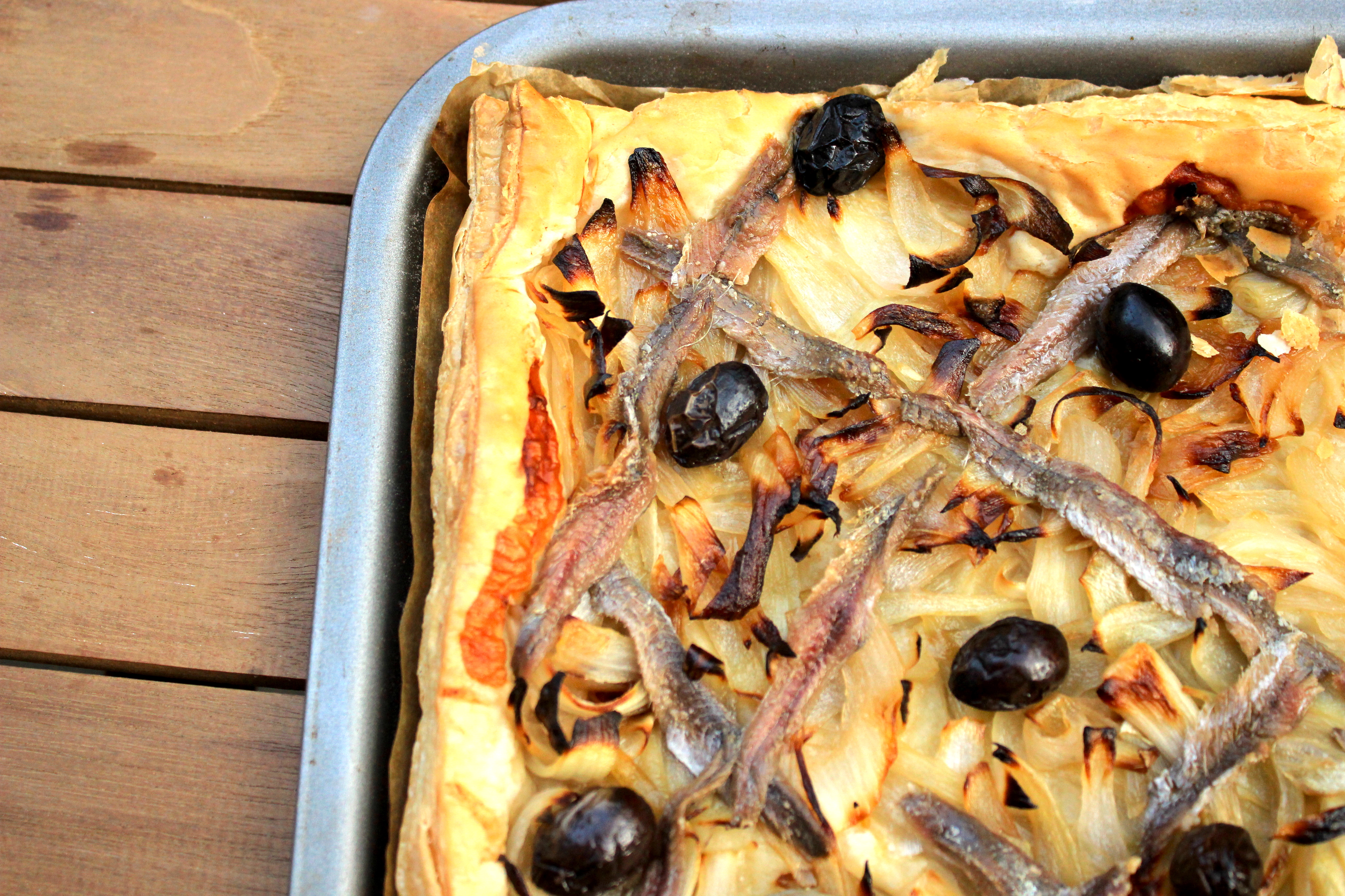 If I have a lunch to prepare at the last minute but still want to have a little wow factor I will alway think towards a tart or a quiche. I always have a frozen puff pastry in the freezer, and who doesn’t have onions. Now the magic ingredients are the anchovies and the olives. My mum visited last week end and brought us beautiful whole anchovies in oil, and some nice garlic black olives from France. You can go for any olive you can find, but try to get good quality whole anchovies so they keep their shape and don’t melt away during cooking.