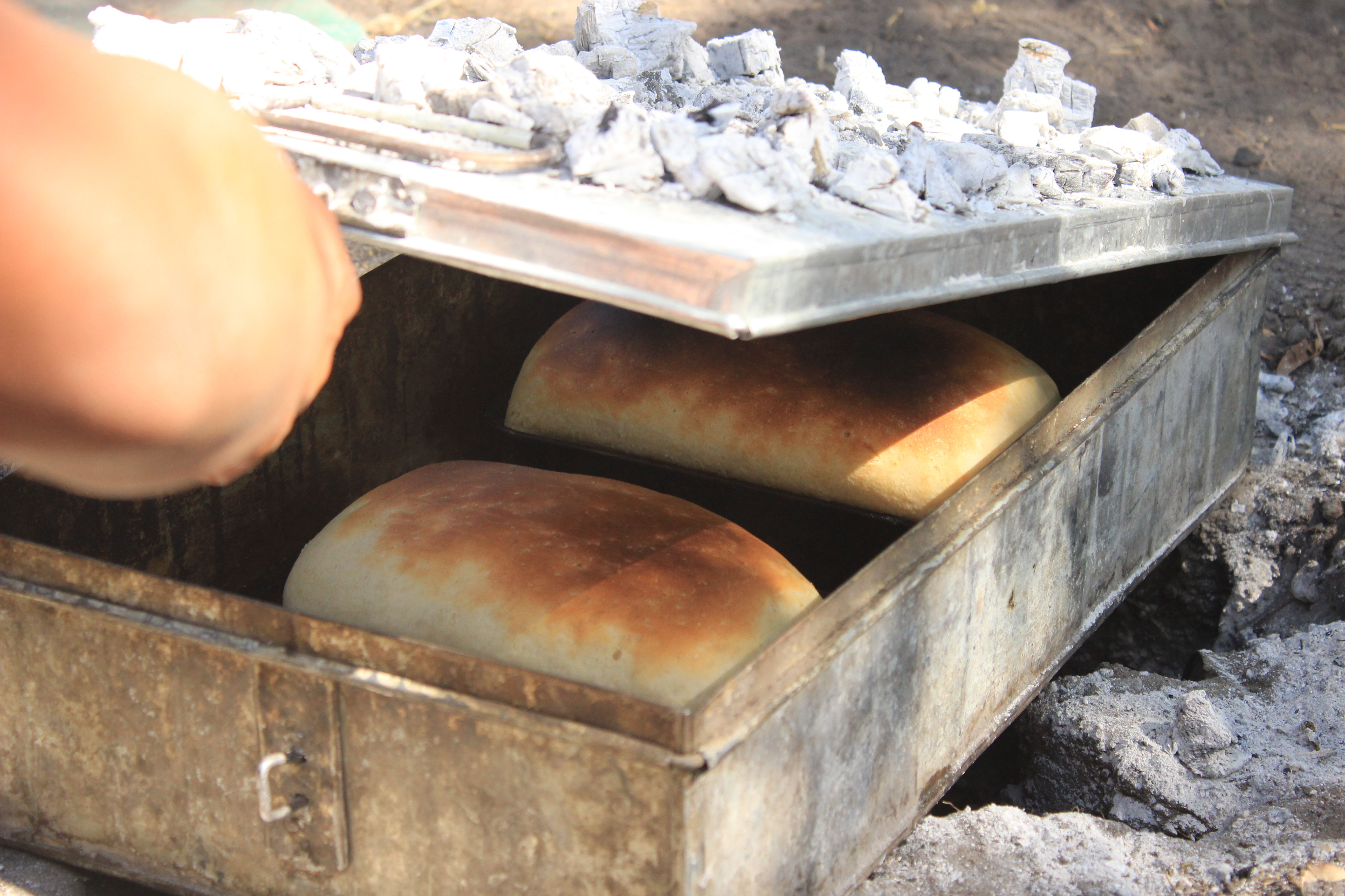 Elephants love Acacia pods, also called Elephant Chocolate, they come and shake the tree with their head to get the pods to the ground and satisfy their craving. Incredible to watch but nothing could take my mind off Pula’s bush oven: A big hole probably about 50cm deep, lined with hot coals at the bottom, and a metallic box on top. The hole must be larger than the box to allow air flow and provide even baking. He would also add some hot coals on top of the box to give a nice colour to the cakes and breads.