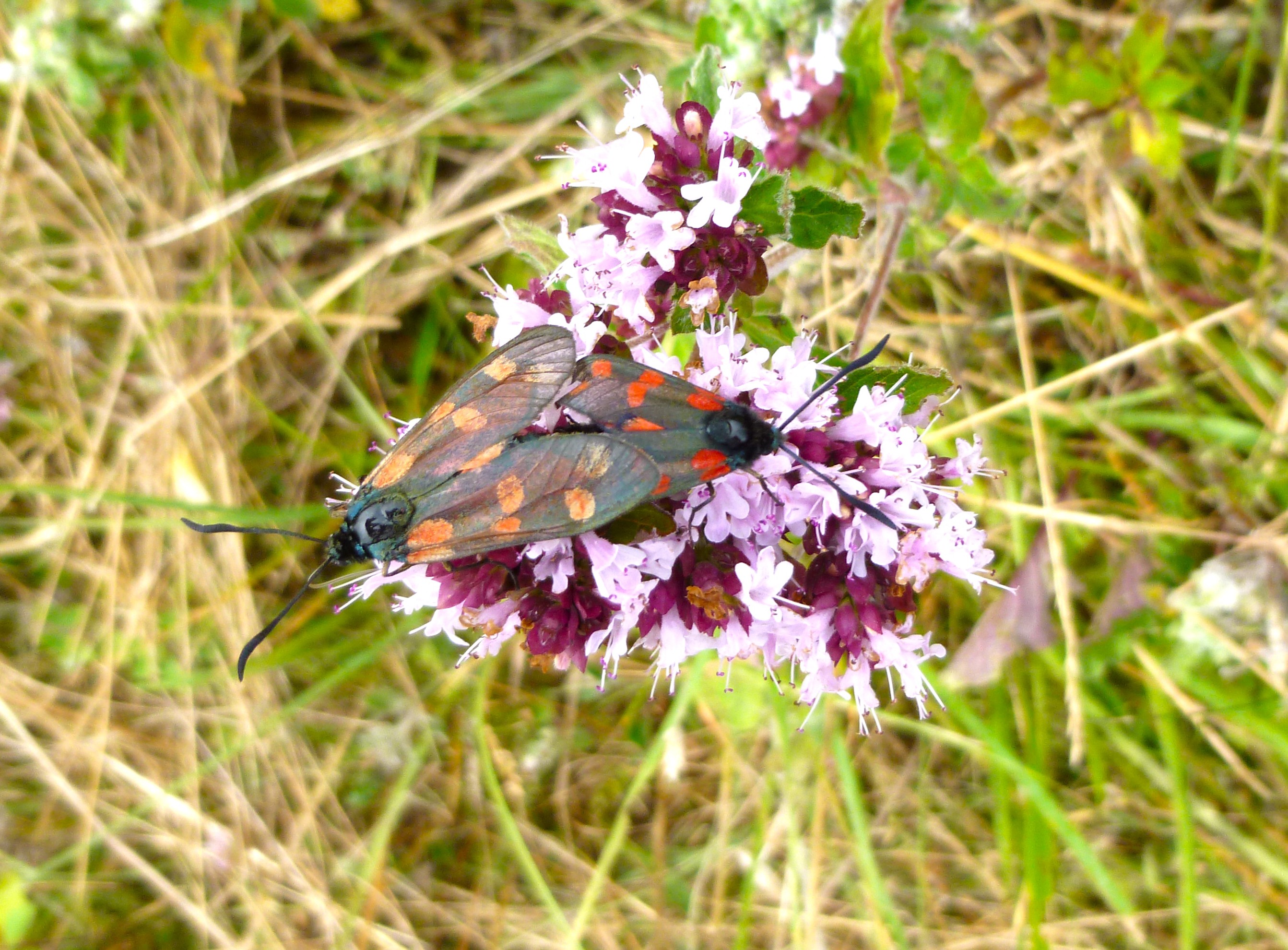 Another discovery was Wild Marjoram. This is quite useful since our Oregano plant didn’t like the heat from the past few weeks and doesn’t look like I will be able to cut nice branches to dry for the winter months. Marjoram is from the same family as Oregano and is a very good substitute when cooking, although a little weaker. Add it to a can of tomato, along with salt, a little thyme, garlic and an onion cut thinly, reduce for 15minutes and you have the perfect sauce for pasta or pizza topping! The pretty Marjoram flowers even created a romantic setting for these Five-spot Burnets to mate. I now have a bunch of Marjoram drying nicely to use later in the year when my Oregano plant will be hibernating.
