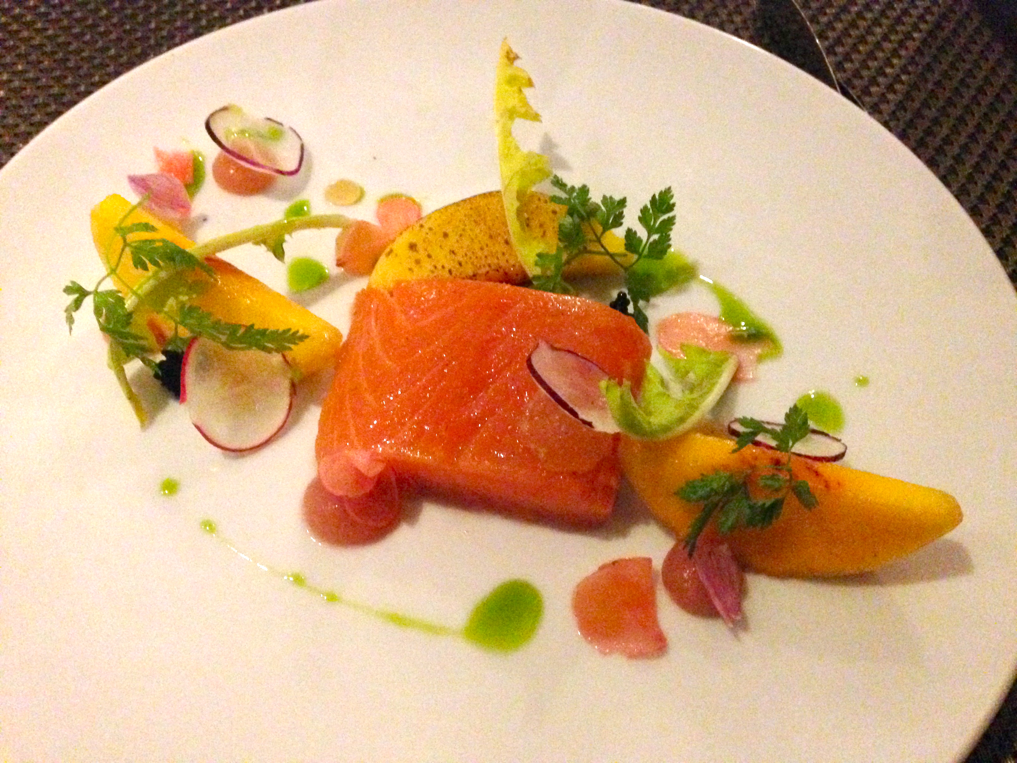 The dish that reflected the most Adam’s performances seen in TV was my Fennel pollen Salmon, Peach, Radish, Dandelions. The finesse of the presentation and the flavour combination were all spot on and it was probably my favourite dish of the evening. My husband starter had goats curd which really didn’t work for me as I am not a fan of goat cheese.