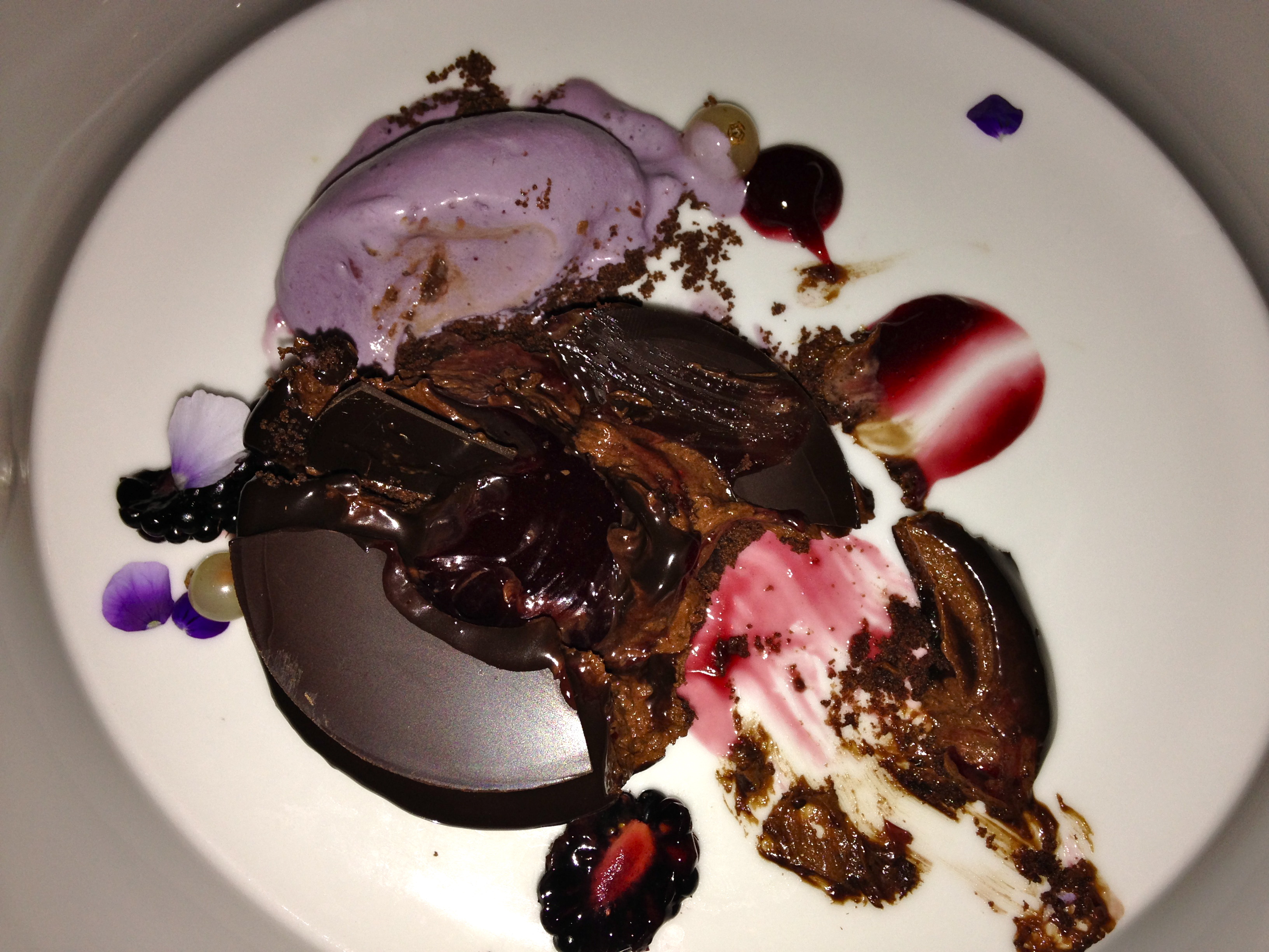 The dessert was intensely chocolaty and was a nice end to the dinner. As you can see I was so tempted to see what was under that tempered chocolate top that I forgot to take a picture before the damage…