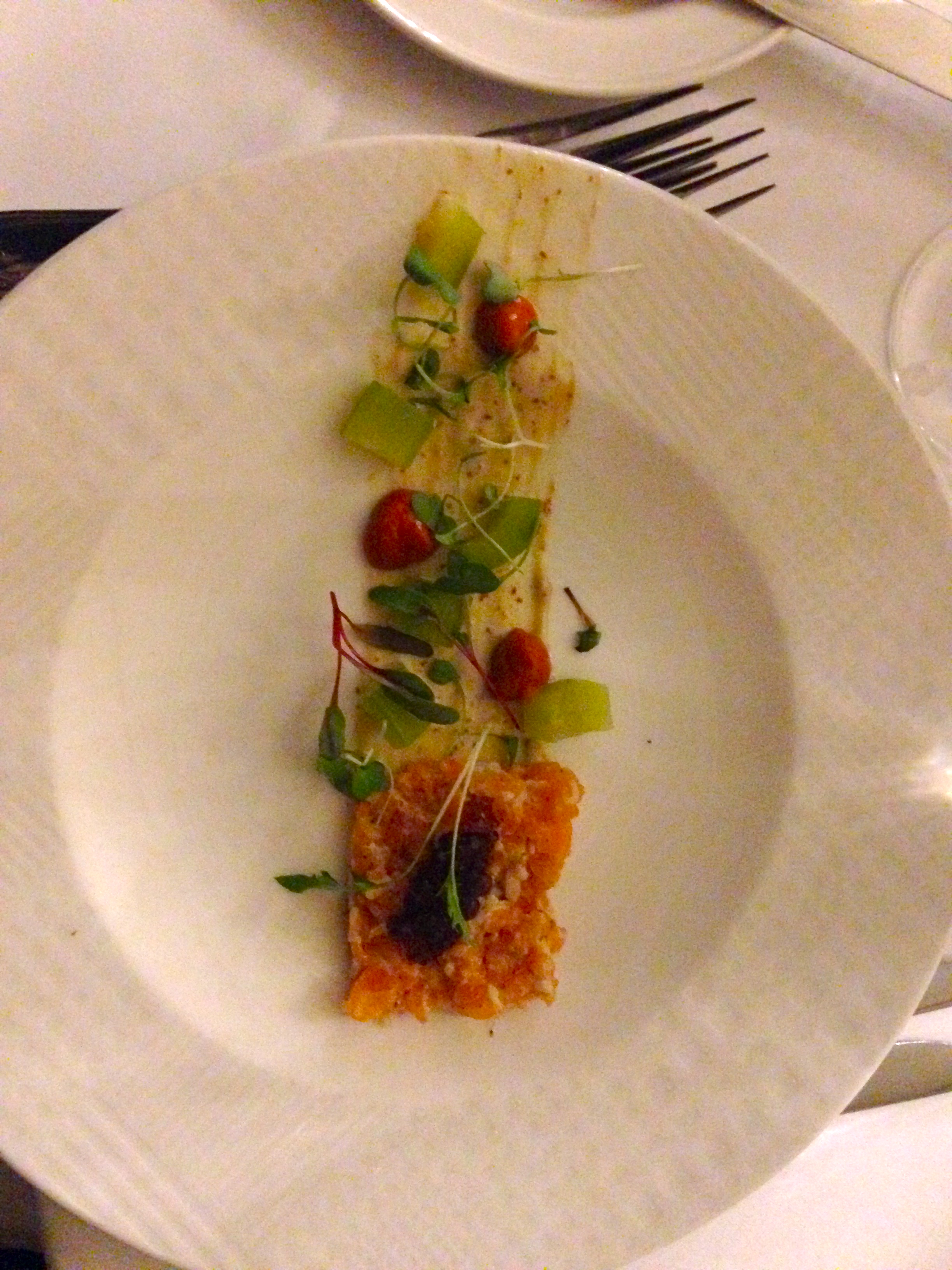 Our dinner was the opposite of cosy and intimate as we sat in this airy room, with very high ceilings and unfortunately very cold. I was so cold I had to ask for my coat back to place it on my legs and we ordered a pot of hot tea at the end of our dinner instead of getting another glass of wine. We booked a table using the bookatable deal offering a 3 course meal and a glass of prosecco for £29. I always thought these deals were meant to showcase a sample of their best food. Their starters surely went along those lines. The trout tartare, with red pepper and cucumber, looked and tasted delicious. The smoked Gressingham duck breast did not taste great as far as duck magret goes, with not enough sauce to go with it. The main was a big diseapointment. We both chose the rump of lamb, and although the red wine reduction was packed with flavour, the rump was unfortuately tasteless and overcooked. I asked how it has been cooked and they said it has been marinated in ginger, rosemary and thyme, pan fried and then finished in the oven.