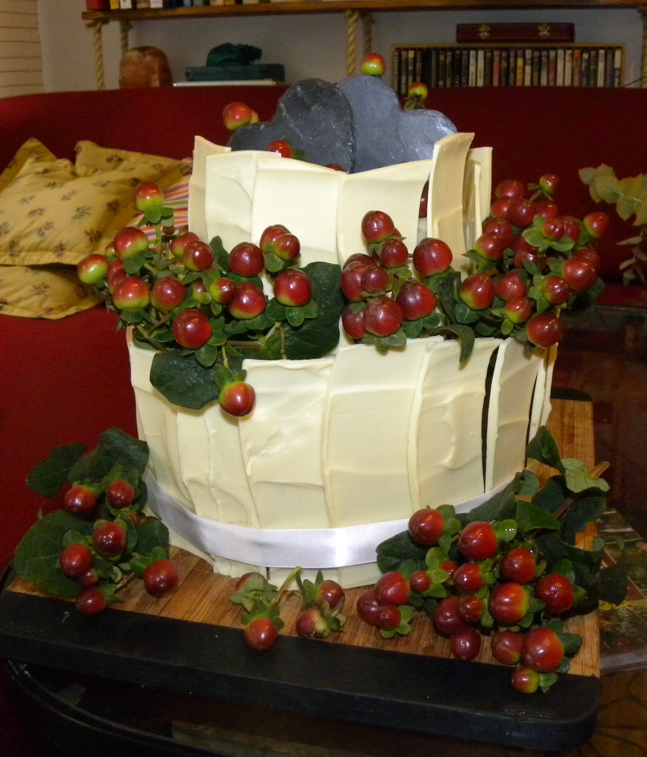 The plan was to make a Jaffa cake for the bottom cake: Orange infused sponge cake, with my own Seville Orange marmalade in the middle and covered with a glossy dark chocolate ganache. The top cake would be a polenta cake, with strawberry jam and covered with white chocolate ganache. Once built, the cakes was going to be surrounded by home-made white chocolate barks. I added some berries already used for my centrepiece to hide imperfections, 2 heart-shaped pieces of slate on the top and here is the result: