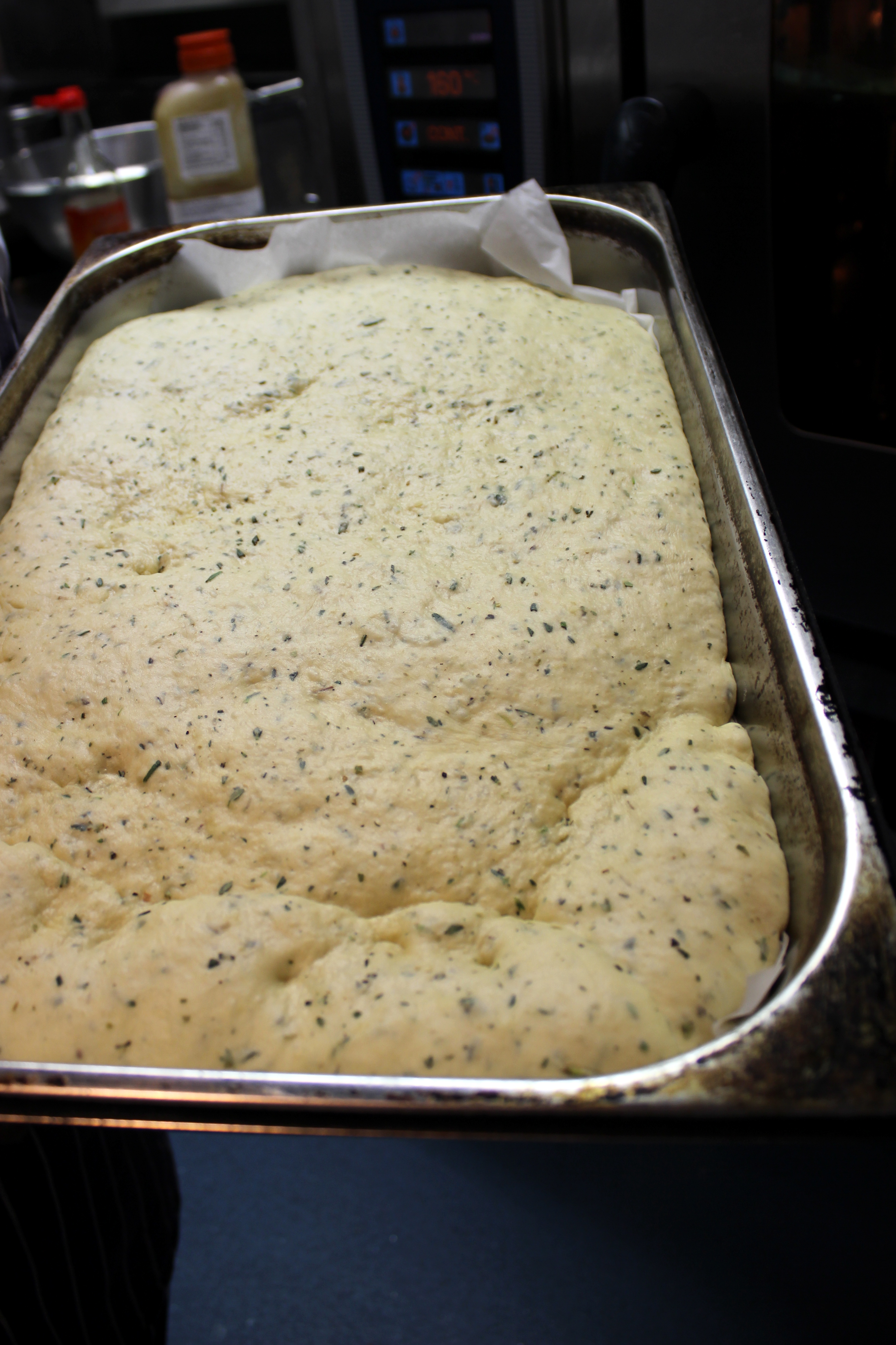 Place the dough in a super large tray covered with baking paper and leave to proof on top of a super hot oven. We left it for 1h and it looked amazing! You could tell the dough was fragile and has risen too quickly because as I was taking the picture one of the corner already started to collapse (as you can see on the picture on the right). We quickly put the tray in the oven at 170C for 20minutes until golden. The top crust should feel firm to the touch and the bread should feel soft, springy and hollow inside. I just couldn’t wait to taste this focaccia! I was surprised the chef didn’t brush olive oil on top of the bread before cooking to give it a good shine. They said some customers complained it was too oily so they now decided to leave the bread as it is and serve it with olive oil and balsamic vinegar. So soft, fluffy and herby. I didn’t need to be dipped in oil to me!